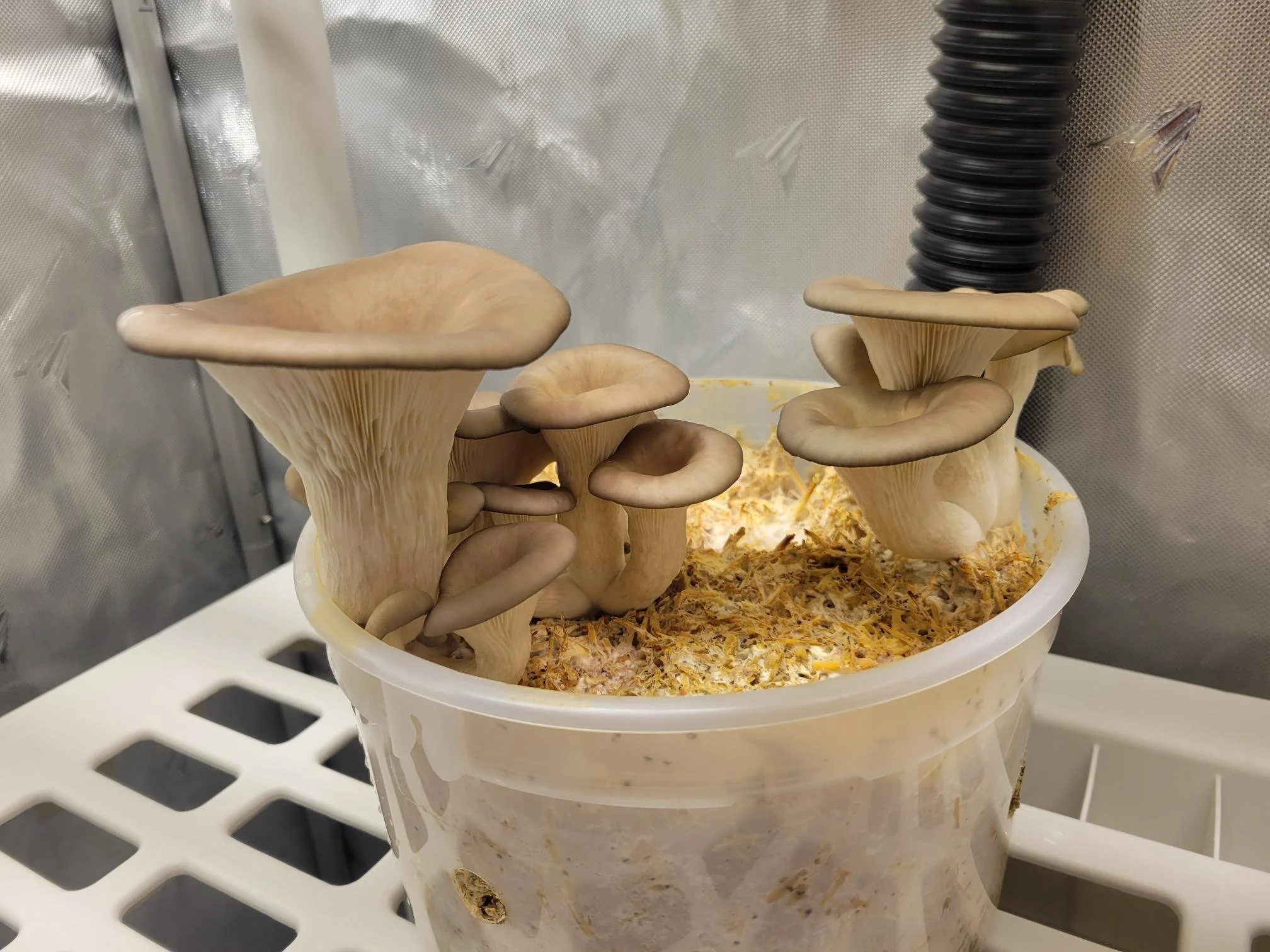 From here the inoculated substrate is placed in our Go Green effort reusable containers to fully mature and begin fruiting in a temperature and humidity-controlled tent environment.
