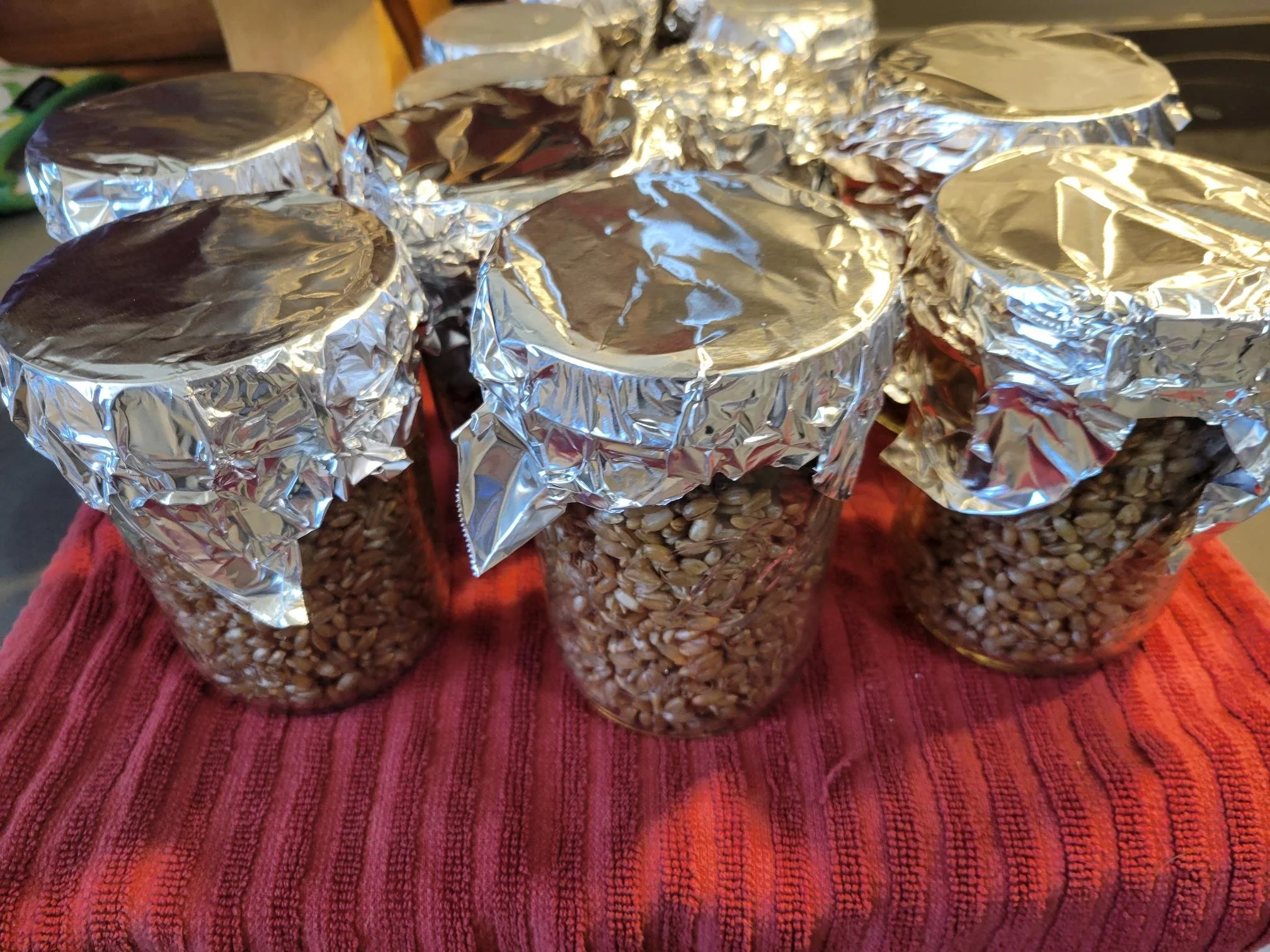 Next is time to prepare the grain culture that this hungry mycelium will feed on to grow into a fully inoculated mycelium culture. The grain is pressure cooked to ensure sterility and placed in jars ready to be inoculated with liquid culture.