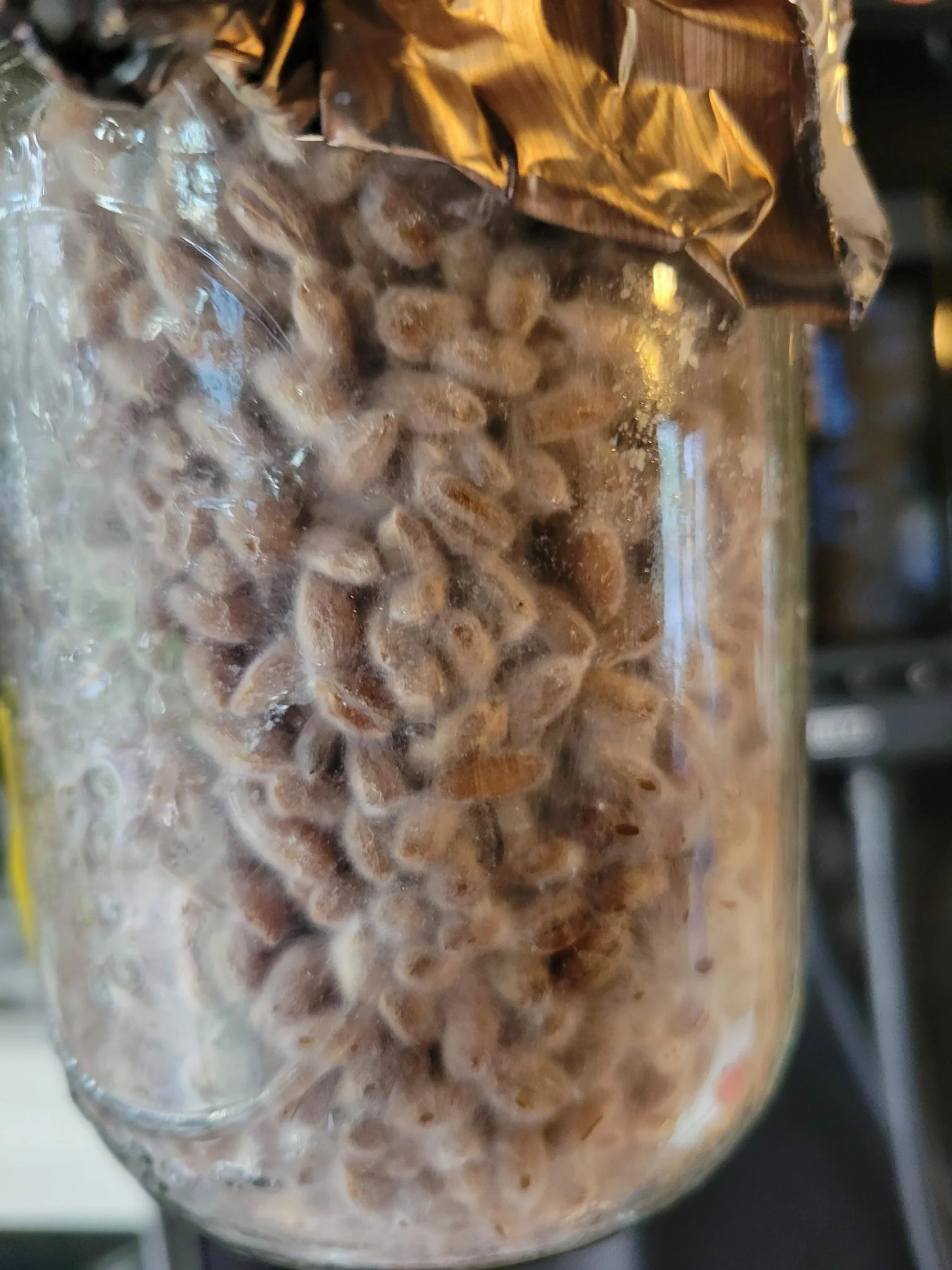 After inoculating the grain culture with the immature mycelium, the next stage of growth begins as the mycelium permeates the grain, resulting in a robust culture seen here.